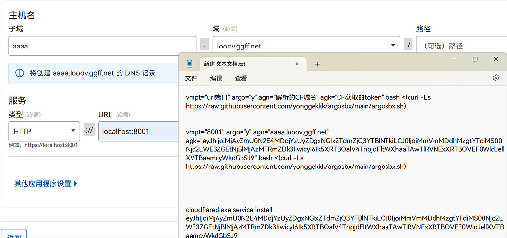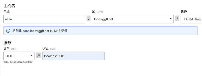 ⑥子域名可自定义——选择已托管在CF的主域——类型选择HTTP——URL 后的端口(如 8001)可随意填写(CF 隧道不依赖 VPS 端口映射)